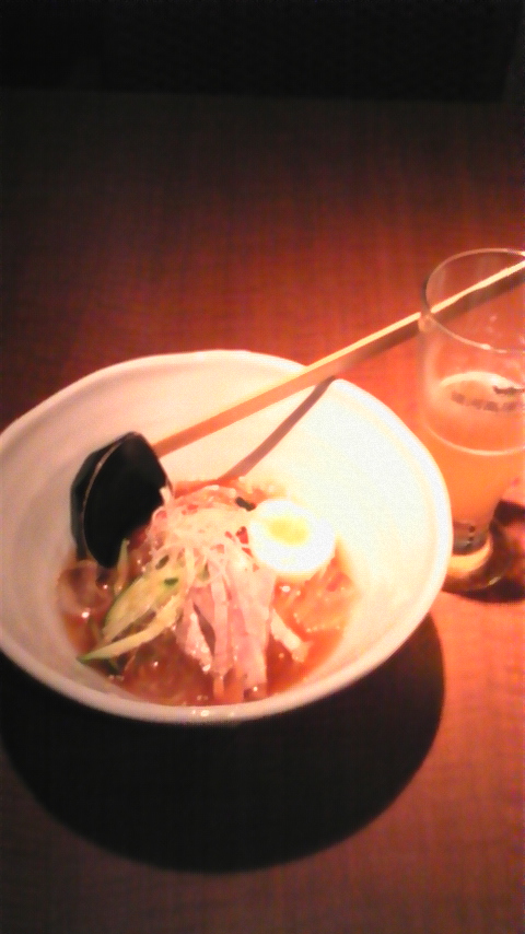 、どうしても食べたいものがあったので、思い切って来てみました。どうしても食べたかったものとは、このお店のイチオシでもある“盛岡冷麺”。この暑い季節にはピッタリで、六本木でもオイシイと評判の冷麺なのです。店内には、あの「どっちの料理ショー」で取り上げられたと貼り紙があるくらいなので、自慢の一品なんでしょうね。写メはその盛岡冷麺と地ビールなんですが、この冷麺はかなりコシがあり食べ応え抜群で、この麺にキムチ・きゅうり・卵・ネギ・チャーシューが入っていて、とてもおいしい一品です。テレビで取り上げられるのも良くわかりますね〜。1人でも食べに行きたくなるのがわかってもらえたでしょうか。キャバ嬢にもファンが多い“盛岡冷麺”は、この暑い季節にピッタリですよ。朝まで営業しているので、仕事の後にビールと冷麺で一杯!なんていうのもいいかもしれませんね。