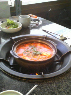 。)、どれがうまいんだかよくわかんなかったので、とりあえず無難に焼肉を少しと写メに写っている「キムチ豆腐チゲ」を注文しました。焼肉は叙々苑クラス?って感じでやわらかくおいしかったですね。焼肉を食べたら次は「キムチ豆腐チゲ」がでてきて、テーブルの上でグツグツと煮えてきました。私は、よくコンビニで1人用のキムチ鍋を買って食べているので、本場モンはどれだけうまいか比べてやろうかと思い、豪快に食べてみたのですが、イヤービックリしました。本場モンのキムチ鍋は超辛くて、マジで味とかよくわかんなかったです。たぶん旨いんだろうとは思いますが想像以上に辛かったのには参りました。今度は、辛さおさえめでメニューを選んでみたいと思います。辛いもの好きのみなさん、『眞露ガーデン』で本場の韓国料理を味わってみてはいかがでしょうか?